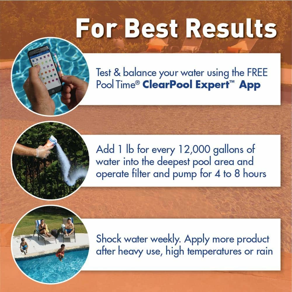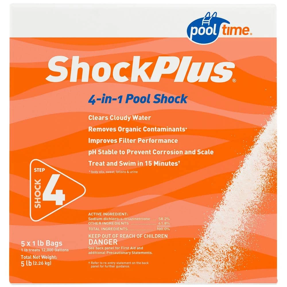 Pool Time Shock PLUS is a 4-in-1 pool shock that combines oxidizers, water clarifiers, flocculants and buffers to help provide crystal clean water without increasing pH. For best results broadcast this granular formula to the deepest end of the pool and wait at least 15 min. Ideal for both last-minute and routine maintenance applications.