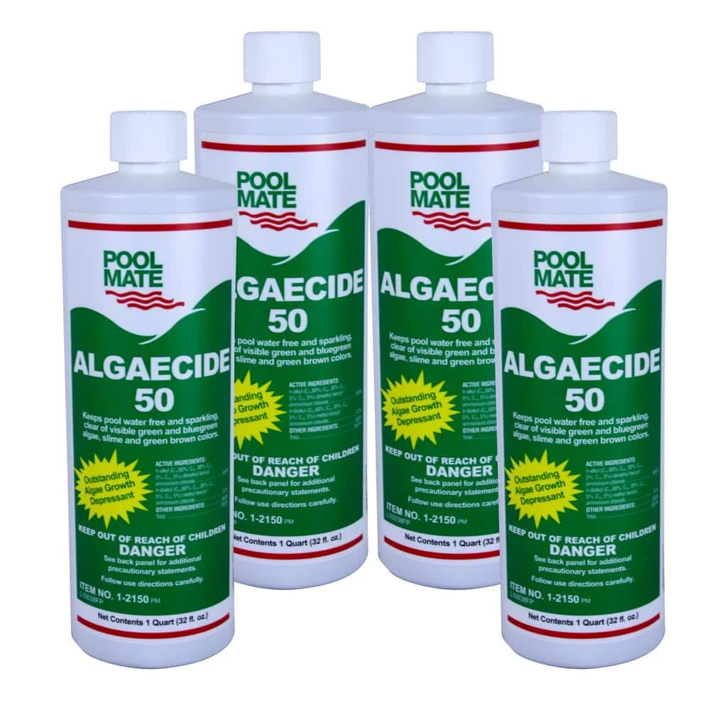 Pool Mate Algaecide is an efficient and economical way to improve the appearance and cleanliness of your pool. It can be added directly to the pool or to the water circulating equipment. Economically priced, Pool Mate Algaecide can be stored for prolonged periods of time without losing its efficacy. Initial dosage: add one gallon of this product per 25,000 gallons of pool water. Routine dosage: add one quart of this product per 25,000 gallons every three to five days.