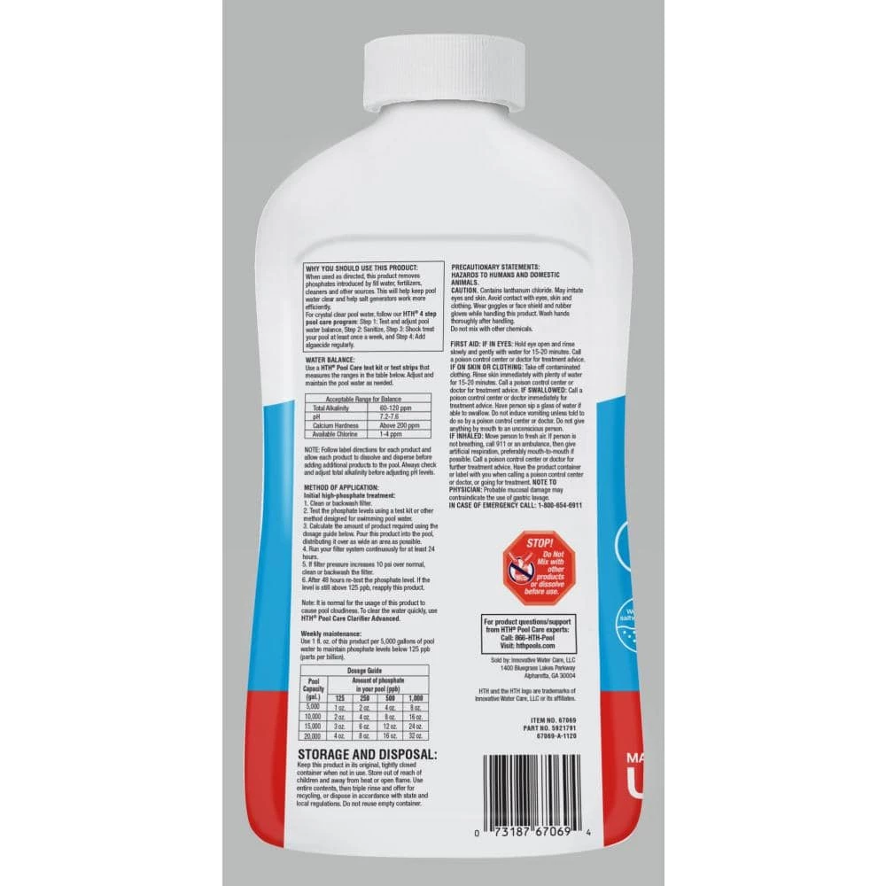 Stop stubborn algae at the source by eliminating phosphates in your pool water. Orthophosphates are a nutrient that promotes algae growth, entering your pool through source water, decaying leaves or lawn fertilizer. Apply concentrated HTH Phosphate Remover directly to the pool water to rid your swimming pool of unwanted phosphates. HTH Phosphate Remover is great for all pool types including vinyl-lined pools and salt-water pools.