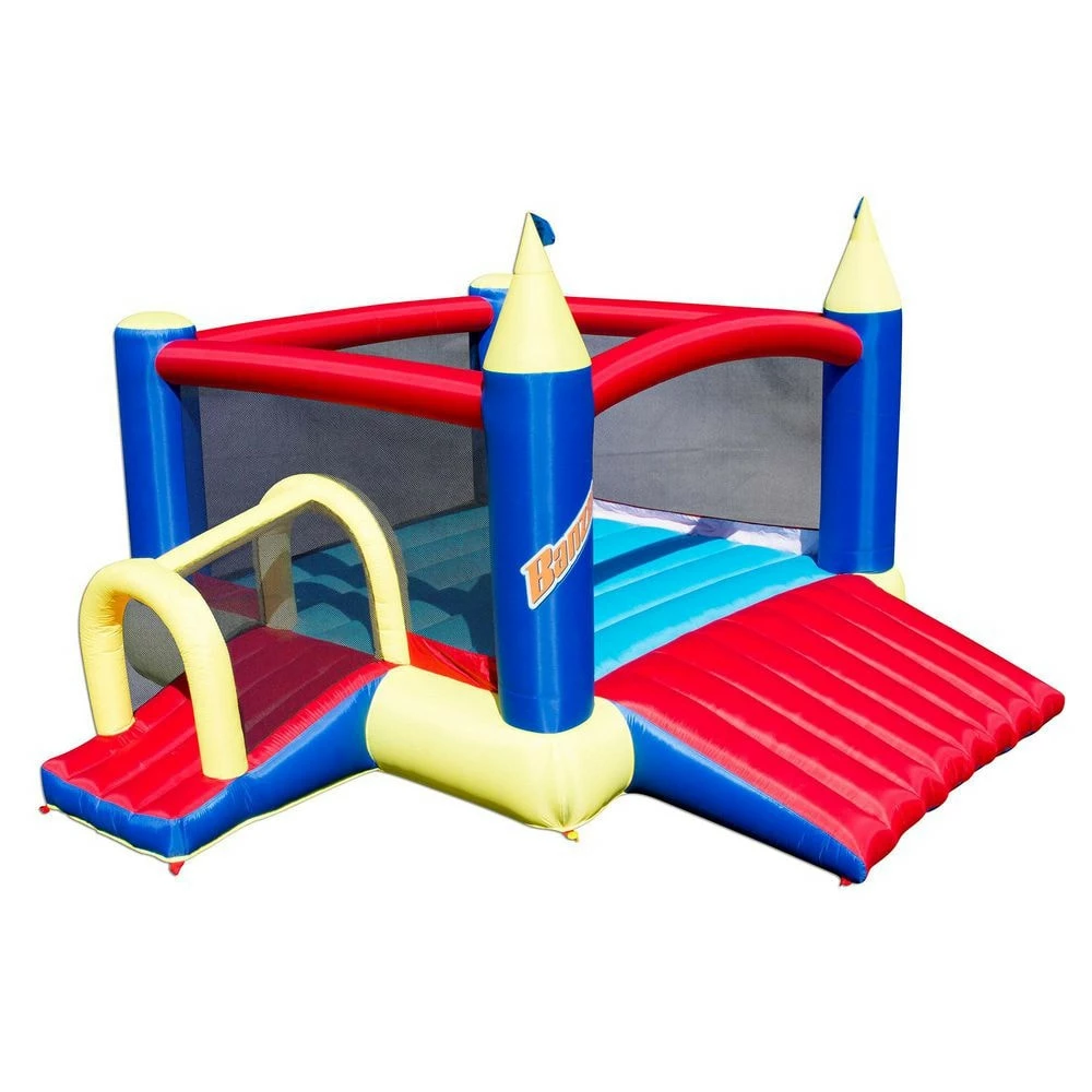 - BANZAI slide n fun inflatable slide and bounce house with soccer net and ball features