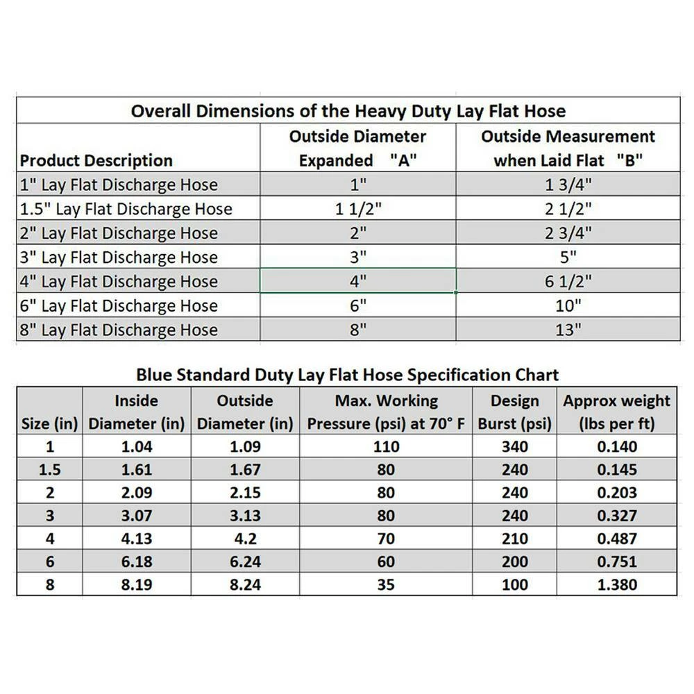 Our 6 Bar, heavy-duty Lay Flat Swimming Pool Discharge Hose, commonly referred to as lay flat hose, pool discharge hose, pool backwash hose, construction hose, pump hose, and flat hose is perfect for use with water, light chemicals and other industrial, agricultural, irrigation, mining and construction fluids. Manufactured with a continuous high tensile strength polyester fiber circularly woven to provide reinforcement, it is one of the most durable lay flat hoses in the industry and is designed as a standard duty hose in residential, industrial and construction applications. Formulated with UV protectant, it is able to withstand outdoor conditions, and is ideally suited for use in pool, spa and other general open-end water discharge applications, greenhouses, nurseries, agricultural use, farm use, construction use, oil and gas exploration and extraction use and for mining discharge.