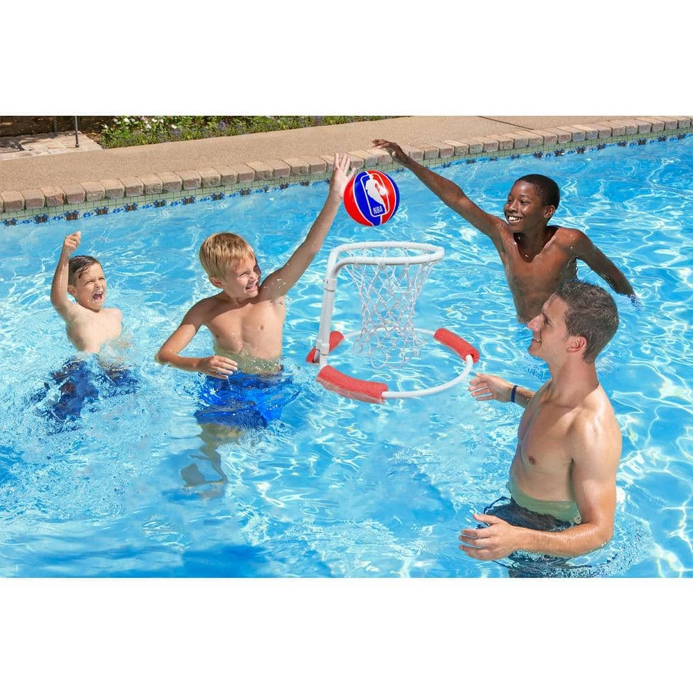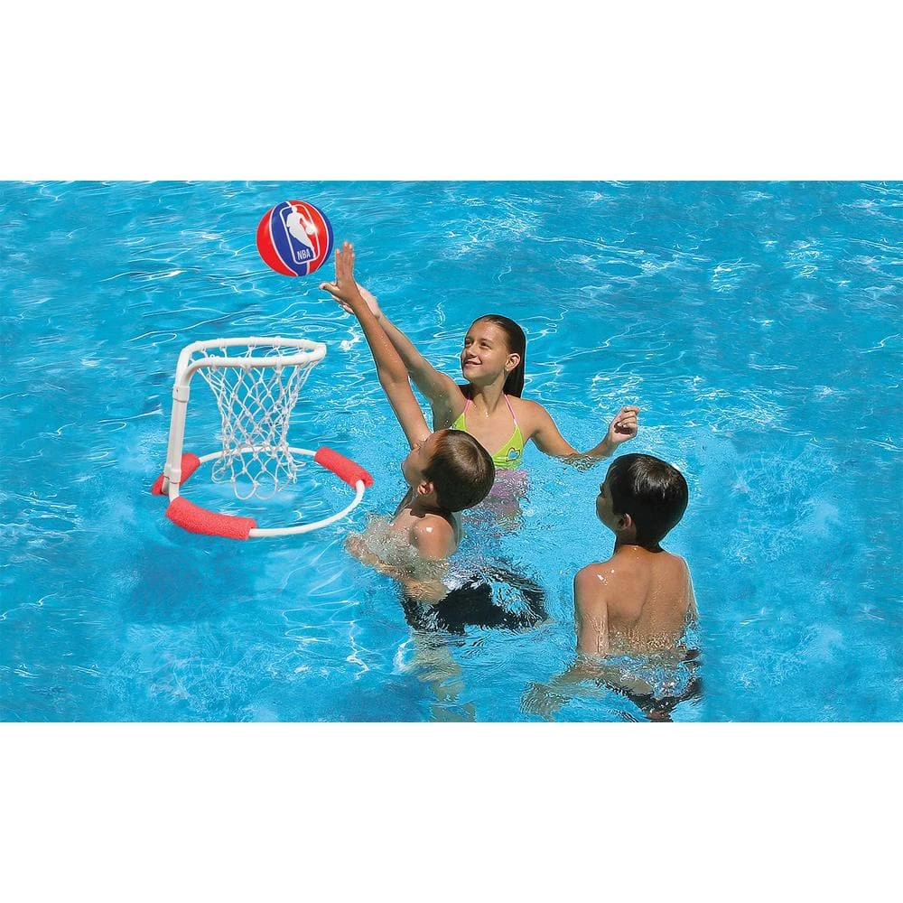 Young NBA enthusiasts can enjoy on-the-water competition with friends and family with our swimming pool basketball game. Or, just practice your jump shot. Smooth vinyl NBA game ball is included and easy-to-assemble instructions are also included with this pool game. The basketball frame is made of durable non-corrosive PVC material and comes with 3 increased in size polyform floats for better stability on the water. An all-weather polyethylene net is mildew resistant. Perfect for building coordination and developing skills for budding young basketball stars or playing at your next pool party. Swish. Recommended for ages 8 plus.
