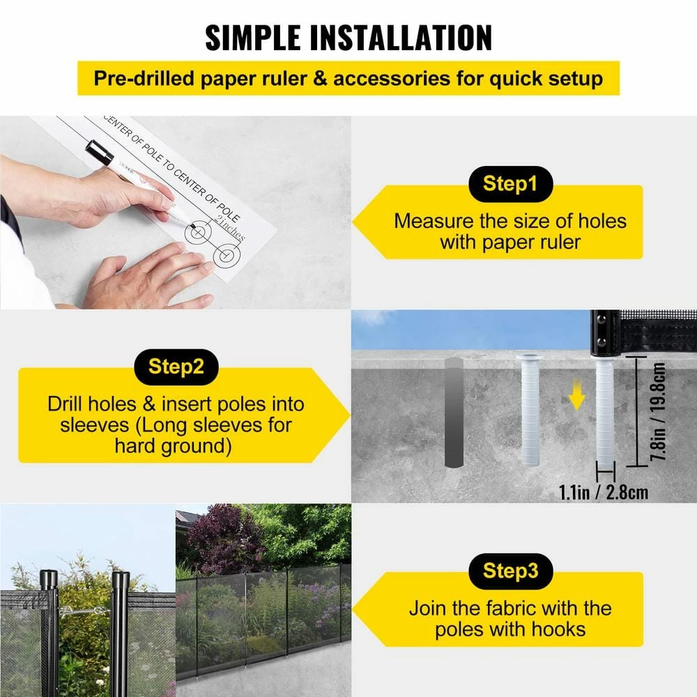 The VEVOR pool fence is made of premium mesh fabric and high-quality aluminum poles, which support a durable construction and can be used for a long time. In addition, two types of sleeves and pre-drilled rulers are provided to assemble quickly. Besides, when not in use, the child safety pool fence can be rolled up for easy storage. In short, happibuy pool fence is an excellent choice for you to keep your children and your family secure.