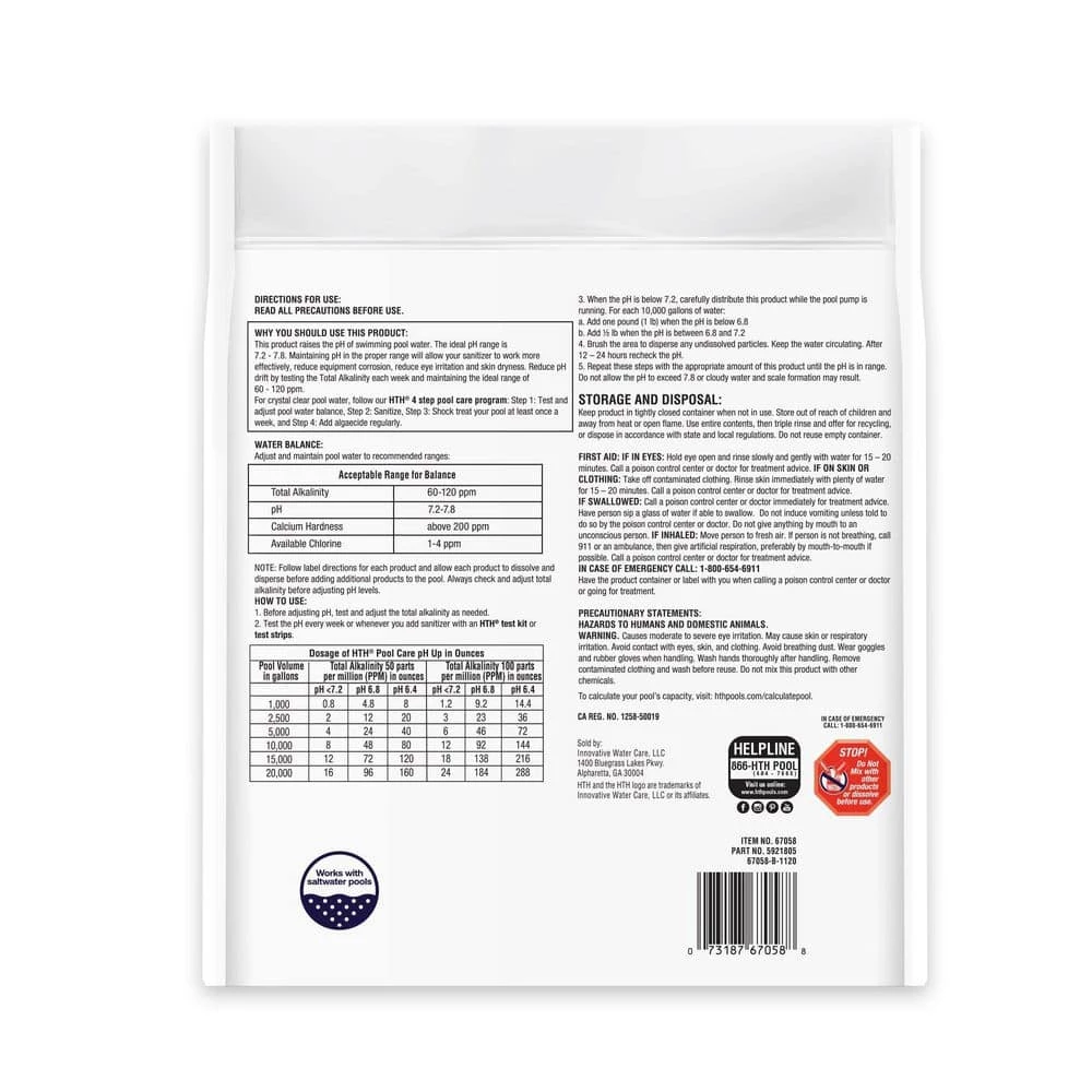 HTH pH Up helps balance the pH in your pool water for healthy swimming. Test your water weekly to make sure pH is between 7.2 and 7.8 ppm. If pH measures below 7.2, add HTH pH Increaser directly to the pool water to raise the pH, prevent corrosion of pool surfaces and prevent skin and eye irritation. HTH pH Up is great for all pool types including vinyl-lined pools and salt water systems.
