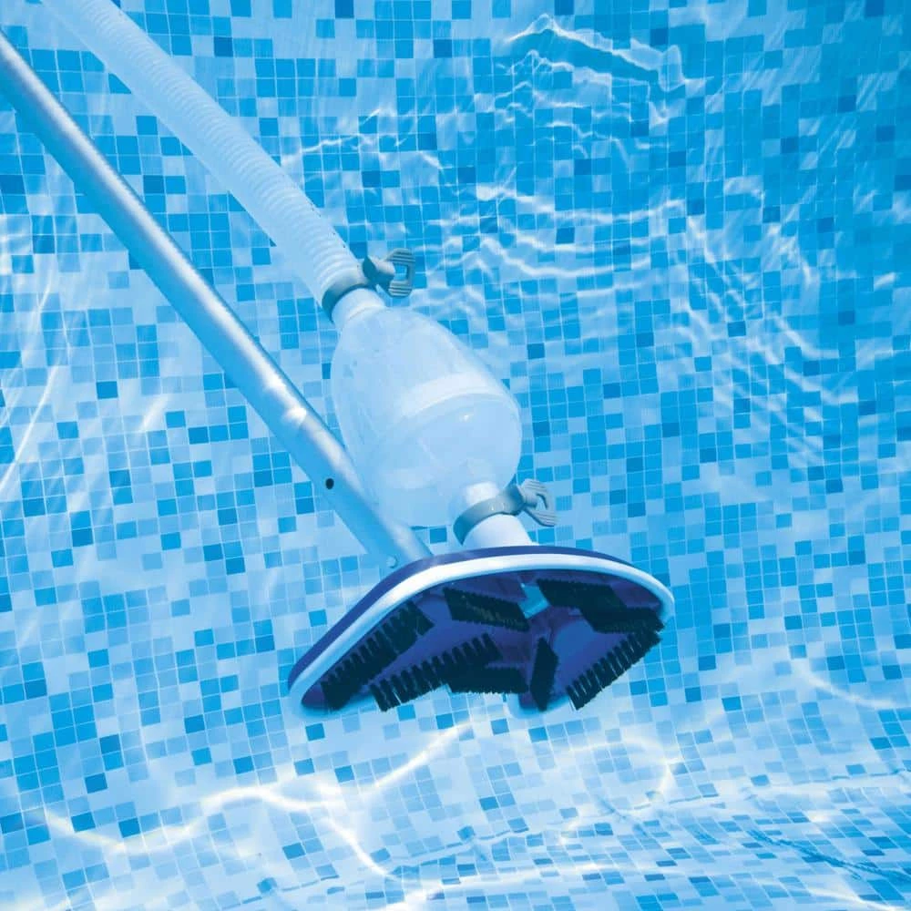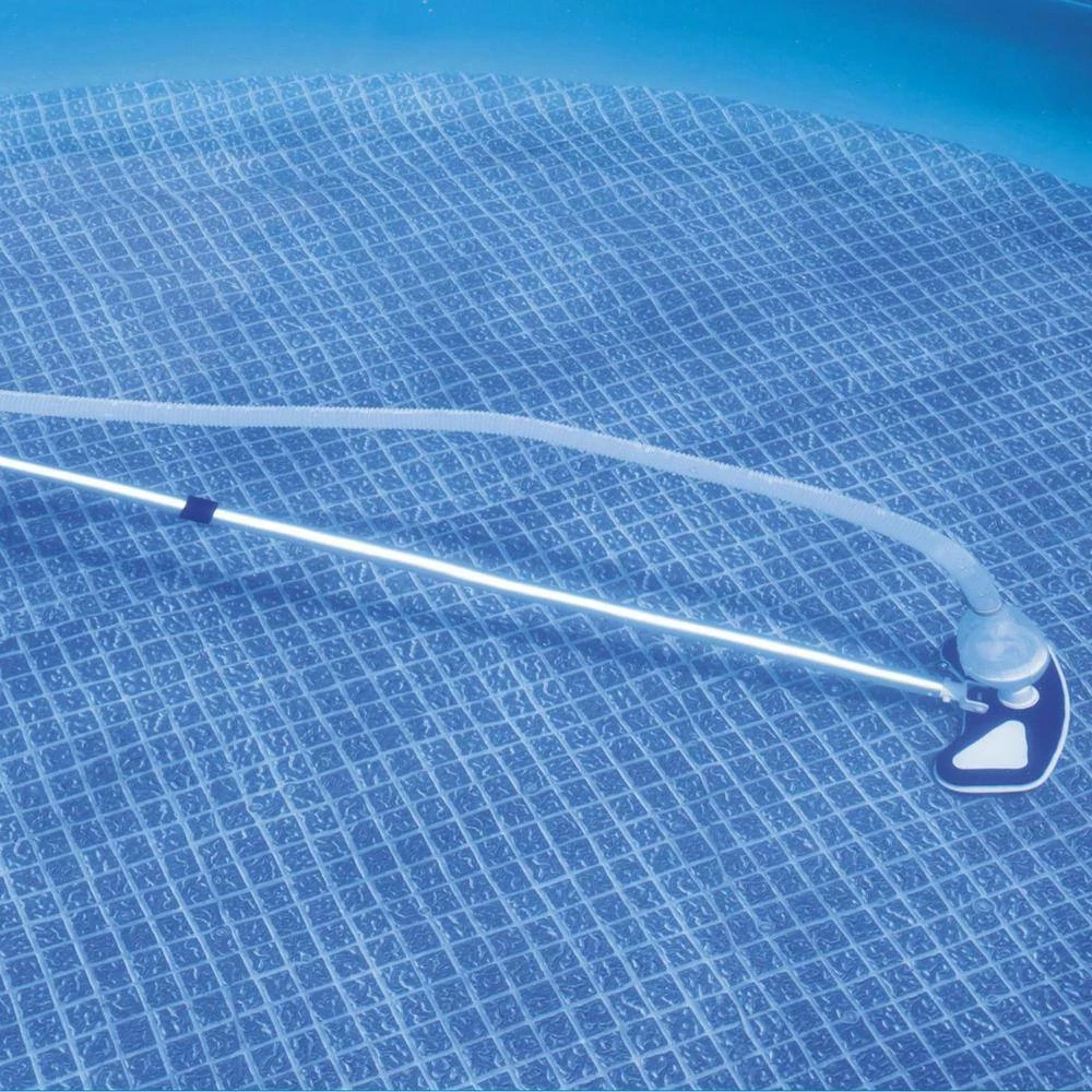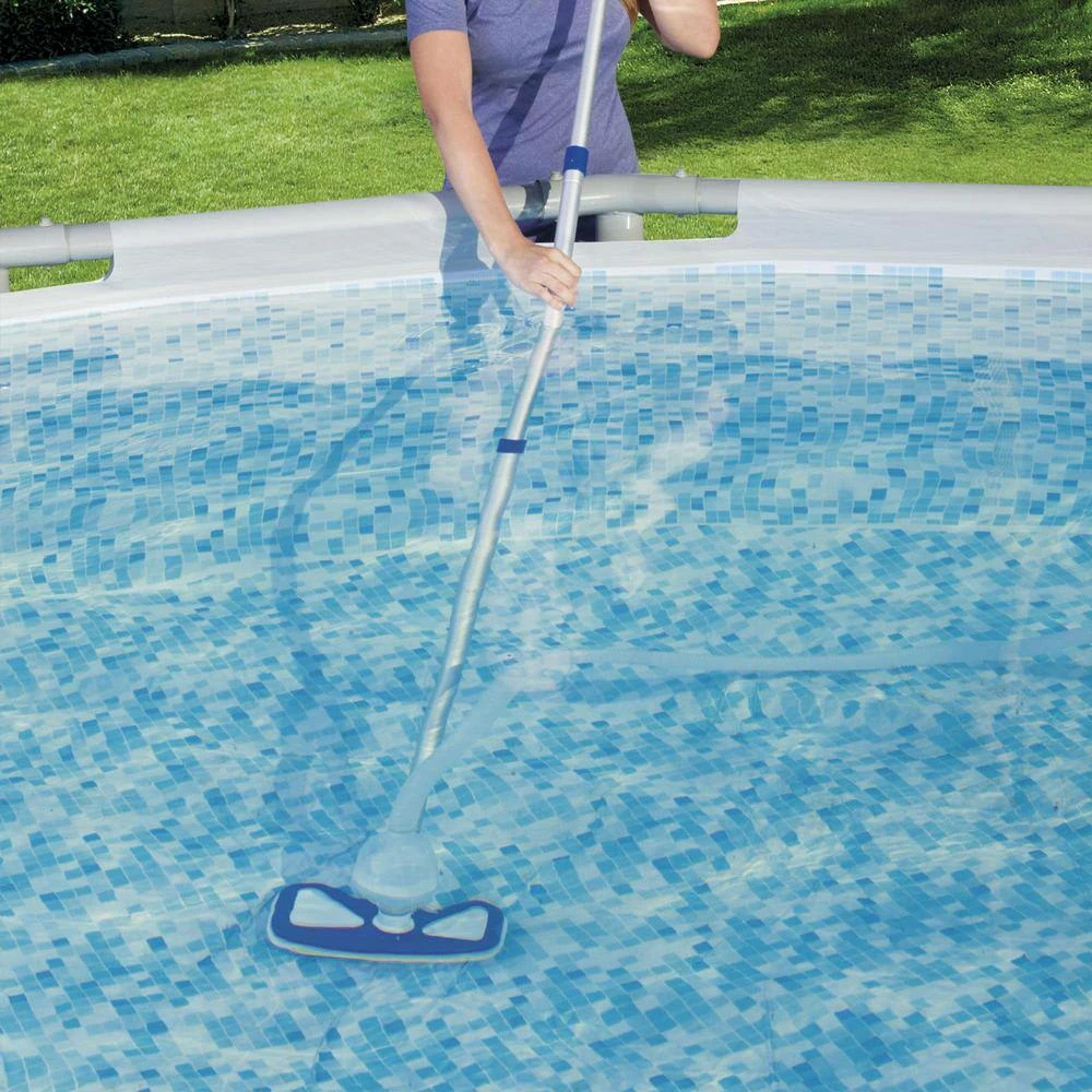 The Bestway Deluxe Swimming Pool Cleaning Kit is a great addition to any above ground pool or pool maintenance set. The kit includes a vacuum and a 9 ft. pool skimmer that will clean out the dirt and debris inside your pool. The skimmer consists of a 110 in. aluminum pole with a durable mesh netting. The net scoops up leaves and floating organics in your pool. The vacuum is powerful, but lightweight and works hard to suck up the algae, debris, and scum lurking in your pool. It attaches to your filter pump and has a 19.7 ft. L hose with a 1.25 in. Dia. The debris piles up in a removable bag in the vacuum and can be rinsed off with just hose water to be reused later. The surface skimmer is made of durable, corrosion-proof plastic. Working with the filter pump, it attaches to the side of your pool and cleans the floating debris in the pool for you automatically. The kit comes with adapter to connect the vacuum to any Bestway pools and filter systems, and works best with a filter pumps with a 530 Gal./hour flow rate. The vacuum and skimmer are ideal for ground pools 15 ft. and below. For simple but effective ways to clean your above ground pool go with the Bestway Deluxe Swimming Pool Cleaning Kit.