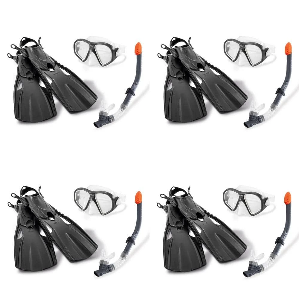 Discover the depths of the deep blue sea or at least what’s below the surface of your backyard pool with the Intex Reef Rider Youth/Adult Goggle Snorkel Mask. (4-Pack) This goggle mask, snorkel and flipper trio are perfect for swimming laps or exploring waters. You’ll be able to keep splashing around swiftly without the need to come up for air every couple seconds. Polycarbonate lenses and the hypoallergenic rubber skirt on the mask keep your eyes water free while letting you see and swim comfortably. This set is ideal for anyone ages 14 and up. (4-Pack).