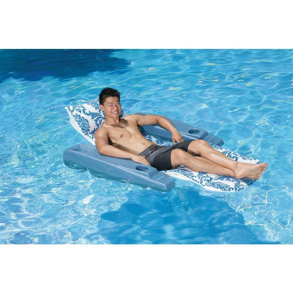 The Royal Hawaiian Adjustable Floating Chaise Lounge is one of Poolmaster’s premier floating lounges offering the convenience of lounging in an upright or fully reclined position by simply adjusting your body position. The high-quality construction features non-corrosive side arms that support up to 275 lbs., along with all-weather fabric in a bright Sapphire Flourish design. Dacron-filled pillow and footrests offer comfort and luxury along with a fully-padded center seat while each arm sports integrated snack and beverage holders.