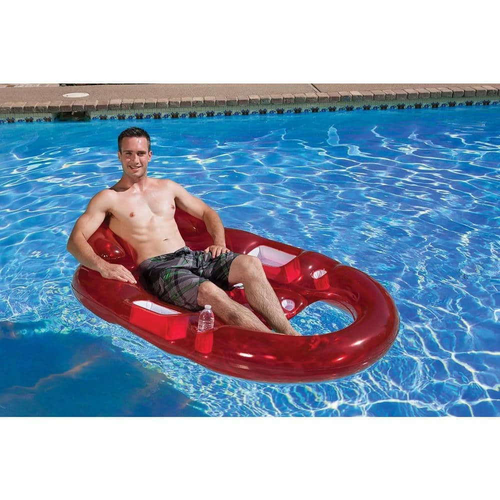 Treat yourself to the Deluxe French Lounge and maximize your comfort in the water. Offered as a 2-pack set in a vivid blue and red vinyl, the Deluxe French Lounge features built-in beverage and snack pockets, perfect for serious backyard vacationers. The tufted pocket construction and head rest work well together to provide full-body comfort, while the open-leg design makes cooling off a breeze.