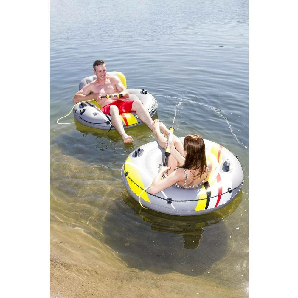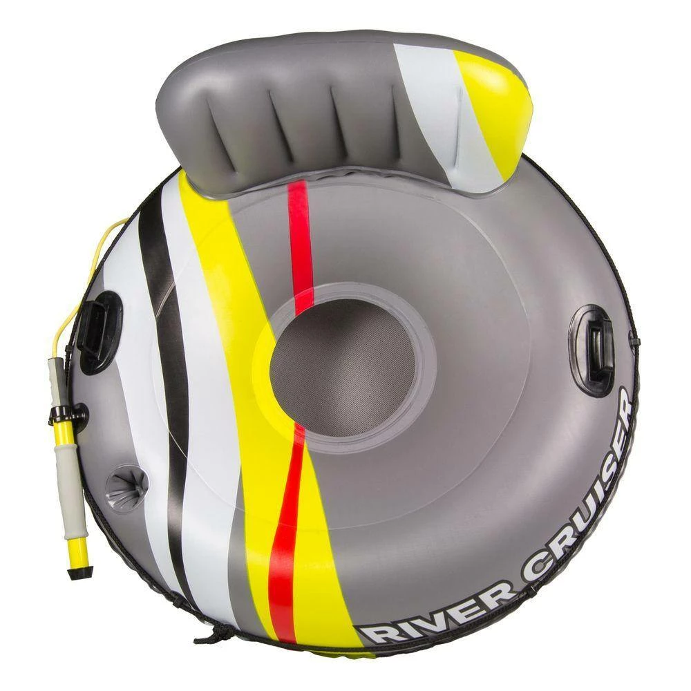 If you’re looking for wet in wild fun on the river or lake, Pool master’s River Cruiser Lounge is ready for action. The River Cruiser Lounge includes a pump-n-squirt water launcher with an auto-fill water line so you never have to stop for a refill. With each pump, water is pulled through the tubing providing a consistent flow of water with a stream that shoots over 35 ft. The side holster is permanently bonded and conveniently located for you to grab and shoot at a moments notice. Enjoy dueling with friends and family. The River Cruiser Lounge is constructed with on-the-water safety in mind. 2 inflatable air chambers are built into the main seat, with an additional air chamber in the backrest. The large 47 in. Dia profile with oversize back rest supports all body sizes and a built-in center mesh seat is added for all-day sitting comfort. The River Cruiser Lounge features a perimeter rope for tethering as needed or for light towing and two permanently-bonded handles are added for grabbing convenience. A beverage pocket is built-in to enjoy your favorite refreshment between water duels. Constructed in extra-strength 22-Gauge vinyl, the River Cruiser Lounge is built for rough water play and season-after-season longevity. Recommended for adults.