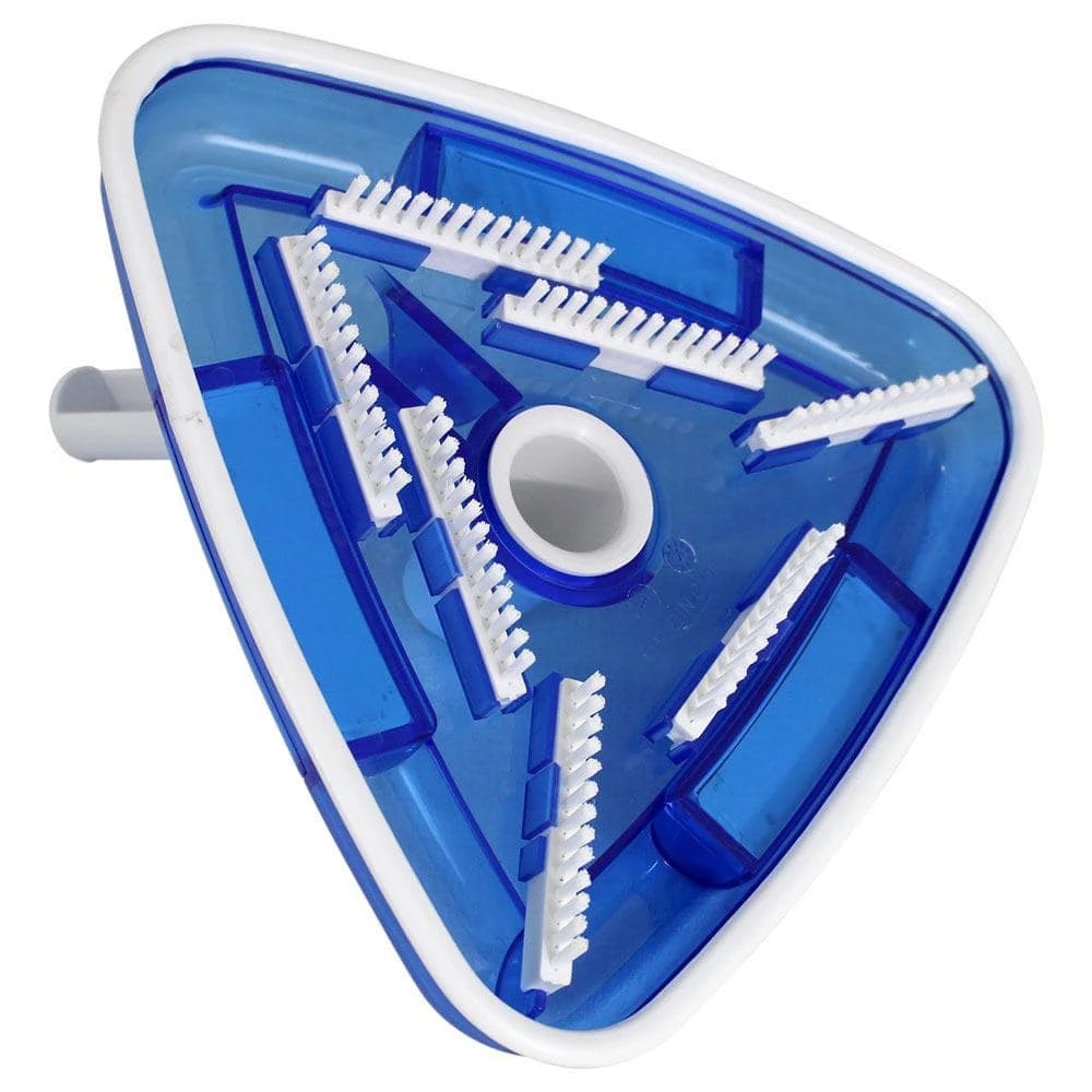 The Pool Mate transparent triangular vacuum head has a swivel cuff that avoids your pool hose from twisting while vacuuming. It’s triangular shape allows easy cleaning of hard to reach corner areas. This vacuum head is weighted with plastic coated steel weights. Fits 1.25 and 1.5 vacuum hose.