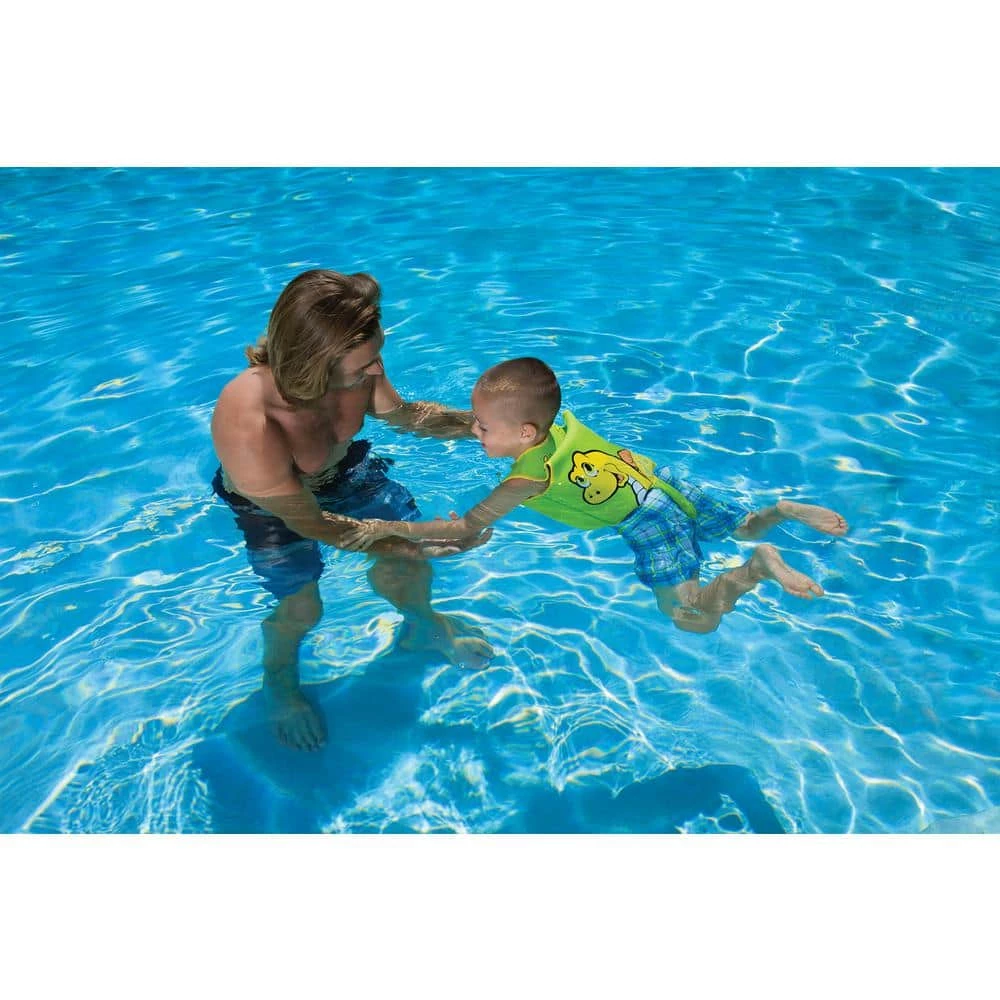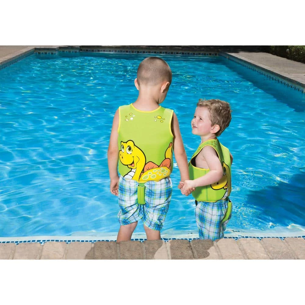 For developing skills in intermediate swimmers, Poolmaster’s Dino Swim Vest is comfortable and made of 100% Neoprene surrounding a closed-cell foam interior which aids in buoyancy. The beautifully designed vest features an easy-glide zipper with tab-top closure. An added security strap is included with a locking side-release buckle. Recommended for ages 1-3 years or weight between 24 – 40 lbs. Swim in confidence, comfort, and style.