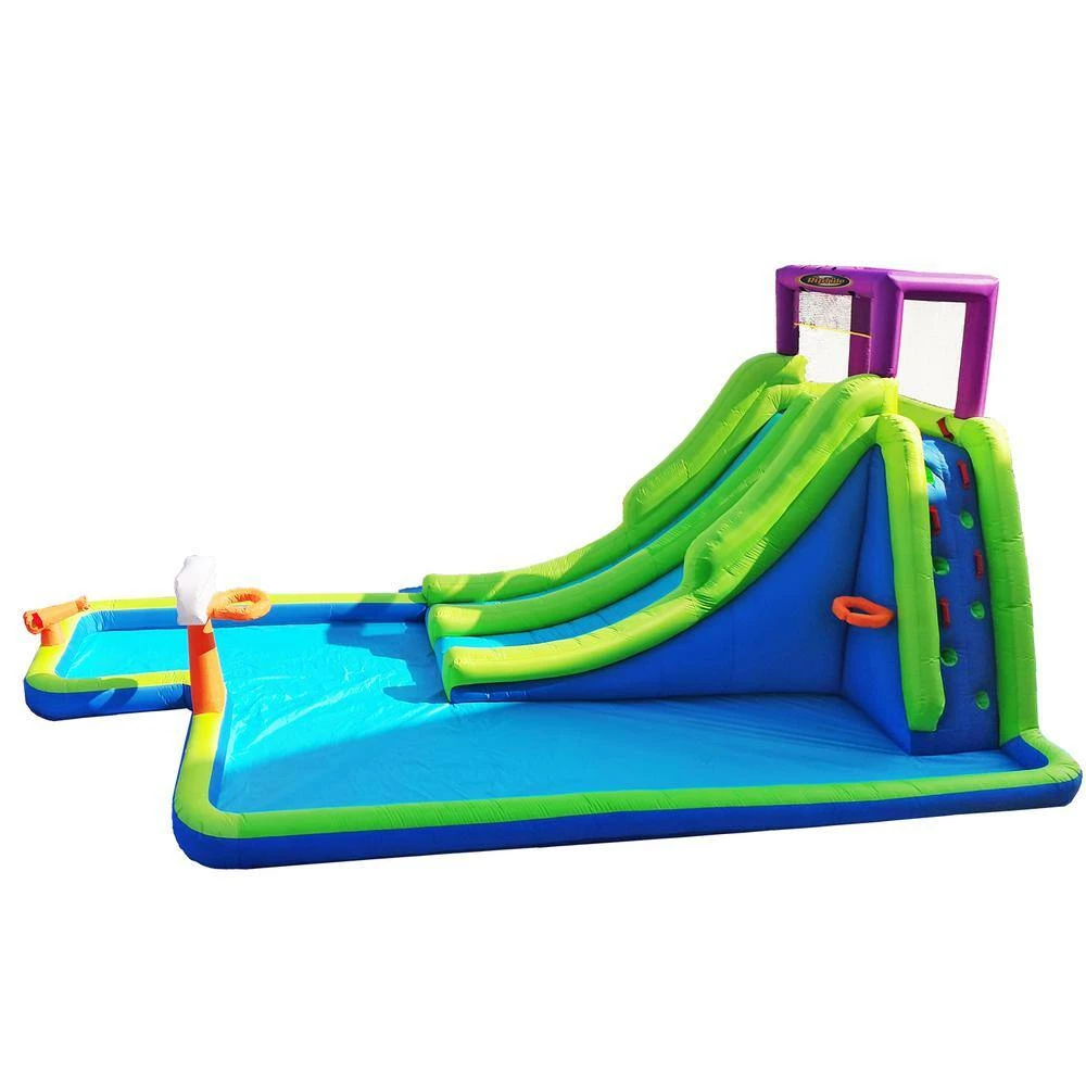 The Magic Time International MTI-91451 Double Racing Slide Inflatable Water Park brings bouncy water fun right to your own backyard. This inflatable water park quickly inflates so there’s no waiting around for summertime fun. Kids can scramble up the climbing wall and race down the slides to the large-sized splash pool. But they should watch out for their friends manning the super-soaking water cannon. 2 inflatable basketball hoops bring another dimension of fun to this inflatable backyard water park. Double-stitched for increased durability, the inflatable water park is made from a PVC-coated polyester fabric that resists punctures and tears. On top of the slides, a platform pagoda with safety mesh walls keeps the little ones safe. Once the summer splash fun is done, the water park bouncy house deflates quickly and is easily folded and rolled to be stored for next year. Perfect for parties, get-togethers and hot summer days, the Magic Time International MTI-91451 Double Racing Slide Inflatable Water Park provides hours of fun for days on end.