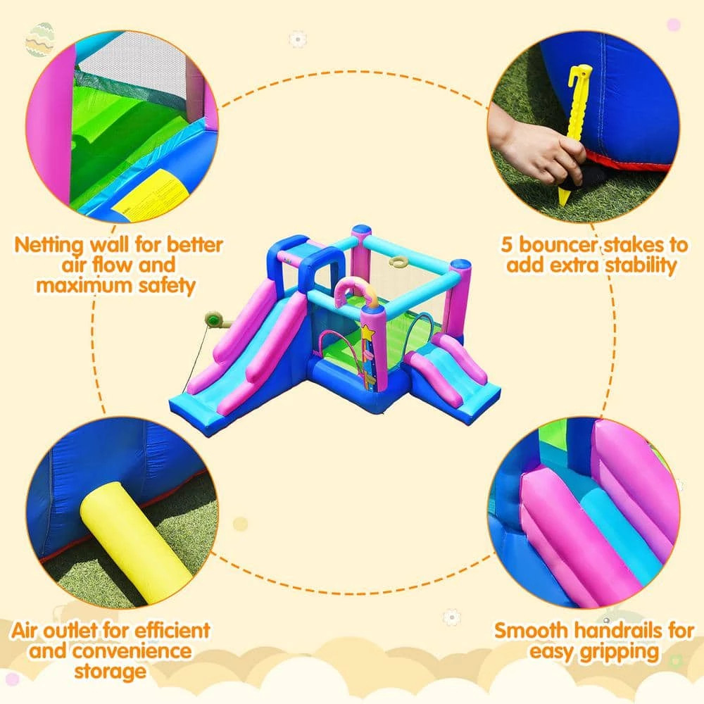 - Multiple play areas for extra-fun: this inflatable bounce house comes with 2 slides, a climbing wall, a large jumping area and a basketball rim, which provides children with multiple ways of entertainment, cute appearance and bright color attract children to enjoy endless of happiness and fun