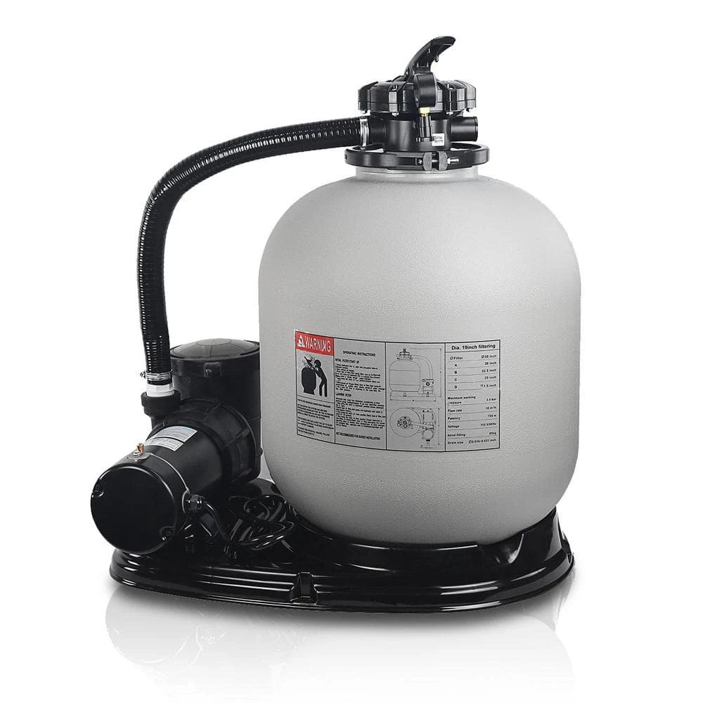 The XtremepowerUS 19 in. Sand Filter System with 1.5 HP Self-Priming Pump delivers a pumping capacity of 4500 GPH. This s and filter pump is used to keep your above ground pool water clean, soft and refreshing. The s and pool filter is constructed with a 7-position VariFlo control valve that is used to keep pools clean and crystal clear for ease of user operation. Can be used in multiple applications for above ground pools and spas of all types and sizes. Ideal for both residential and commercial alike. Our pool s and filters are precision engineered from rugged polymeric material to have all-weather performance and corrosion resistance. The flange clamp design offers 360° rotation of valve that makes plumbing an easy task. This rugged s and pool filter is contrived of an integral top diffuser with full-sized internal piping to ensure even distribution of water to provide a smooth, free-flowing performance. Thoroughly keeps your pool crystal clean and deliver years of hassle-free operation.