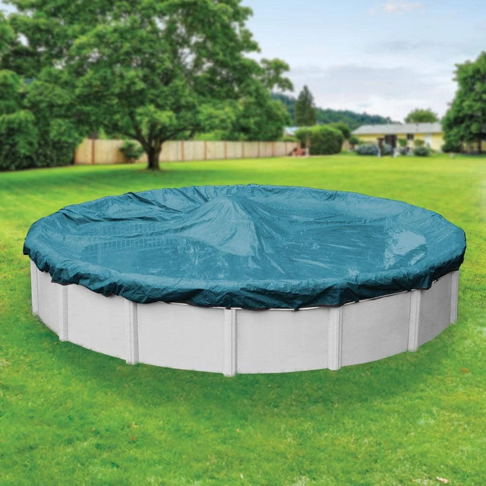 The Robelle Galaxy Winter Cover is a strong, UV-resistant polyethylene solid winter cover for above ground pools. This cover includes a 4 ft. overlap, making this cover easier to secure to your pool than other pool covers. Please order by pool size, as the overlap goes beyond the pool size listed. If you have a very large top rail, please consider a larger pool size. The cover should be able to comfortably float on the pool water without excessive stress. The top of this cover is teal, and the bottom side is black to prevent algae growth. The Robelle Galaxy Winter Cover features a strong 10 x 10 scrim. This cover is constructed with a strong polyethylene material that weighs 2.91 oz./yard2. Both the scrim count and material weight are good indicators of the strength of your pool cover. 2 grommets are placed on center every 4 ft. With these grommets, you should use the included winch and all-weather cable to secure your pool cover. The Robelle Galaxy Winter Cover includes a 12-year warranty.