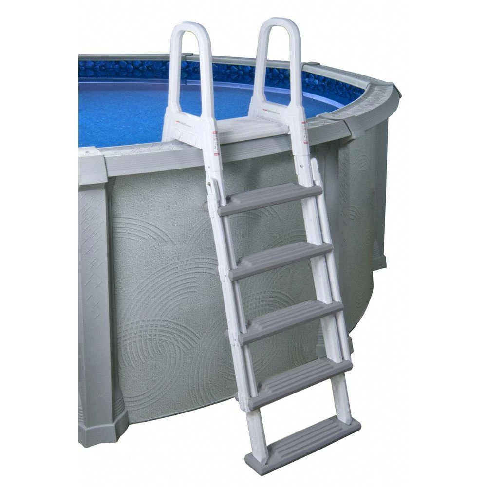 - Anti entrapment barrier prevents kids from swimming between treads or under ladder