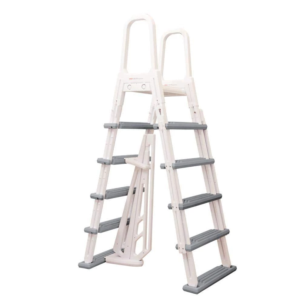 This Heavy Duty resin A-Frame Pool Ladder provides stable entry and exit for above ground steel wall pools with 48-54 in. high walls. Designed specifically to meet new building codes and make safety a number one priority. Wide, non-skid treads for secure footing. Child-proof barrier behind ladder meets ANSI/APSP safety codes to prevent entrapment.
