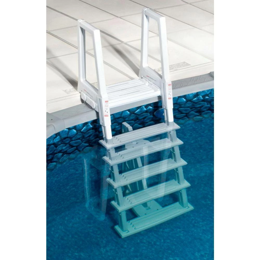 Our rugged Heavy Duty Deluxe In-Pool Ladder makes getting into and out of your pool easier and safer. This durable, injection-molded resin in-pool ladder features a safety barrier to prevent entrapment behind the ladder and extra deep 5 in. non-skid treads for safe & secure climbing. The 5 tread design makes our ladder easier to climb than 4 tread ladders. The 20 in. high handrails make this ladder safe and secure for climbing. Adjusts to fit deck heights from 48 in. to 54 in. Weight capacity up to 300 lbs. 3-Year Limited Warranty.