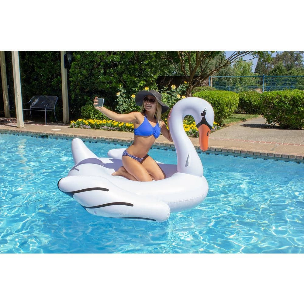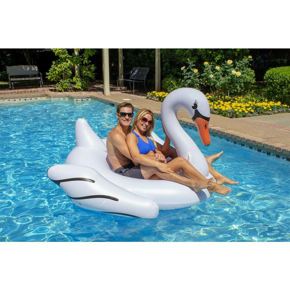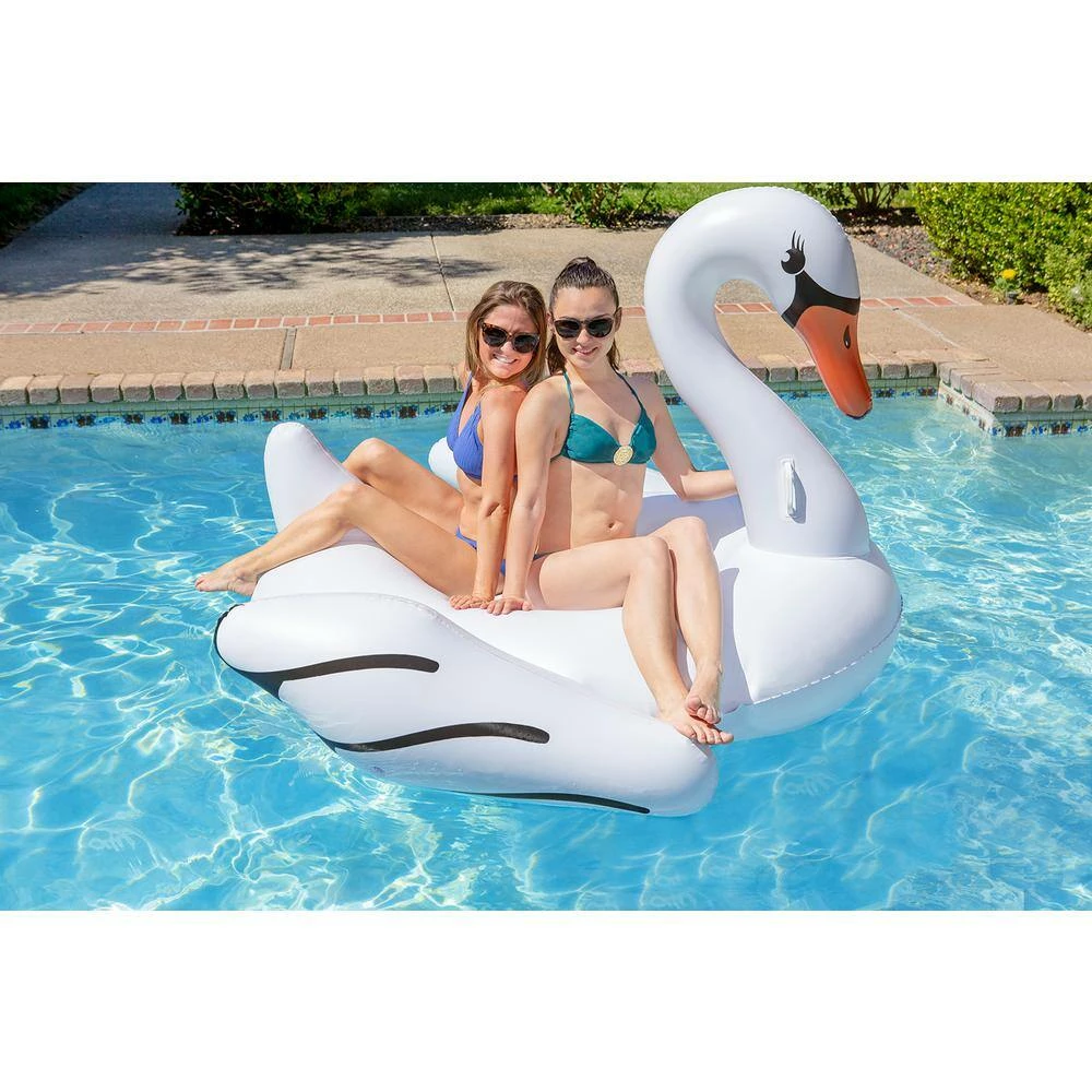Never the ugly duckling, Poolmaster’s Jumbo Swan is a stand-out beauty sure to add fun and elegance to any pool setting. The wide wing span provides on-the-water stability. The oval-shape center island provides ample room for playing, riding, or all-day lounging for kids of ALL ages. 2 bonded handles are provided on either side of the elongated neck. Constructed with durable 12-Gauge vinyl, the Jumbo Swan is a showpiece for any backyard pool and measures approximately 46 in. W x 68 in. L deflated. Recommended for ages 8 and above.