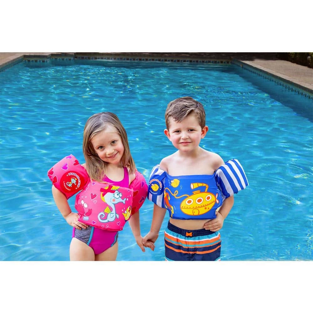 For developing skills in intermediate swimmers, Poolmaster’s Lil’ Splashers is a comfortable training aid made with deluxe Oxford Polyester fabric that is soft against the skin. The generous EPE foam interior aids in buoyancy. The arm floats are secured to the body and allow for full range of motion. The adjustable strap features a snap-together buckle. Recommended for ages 3-years to 6-years or weight between 30 lbs. to 50 lbs. Swim in confidence, comfort and style.