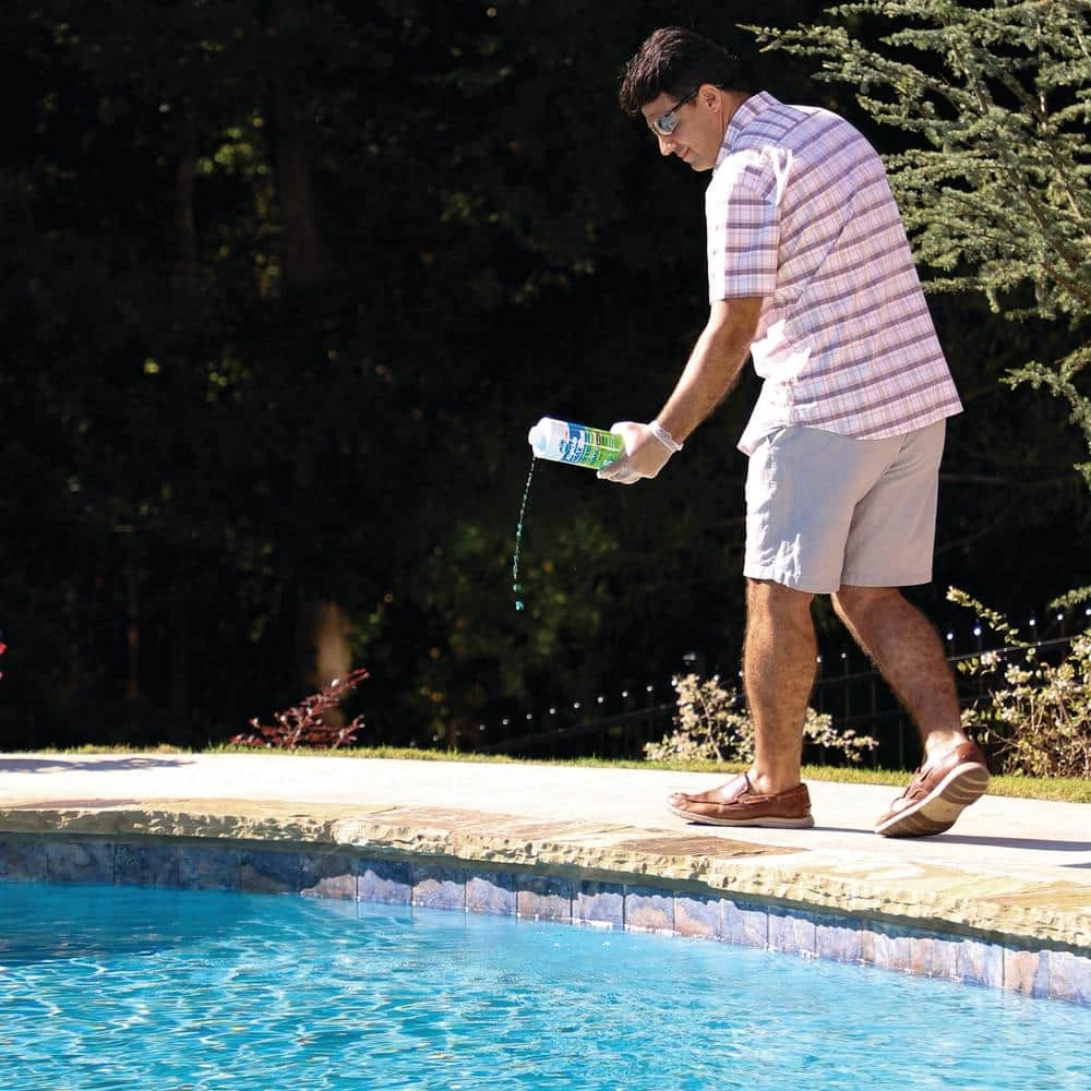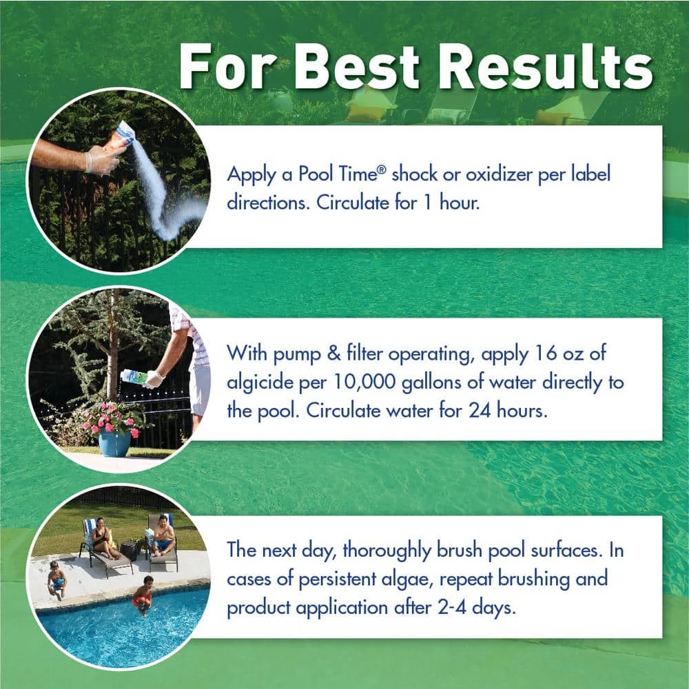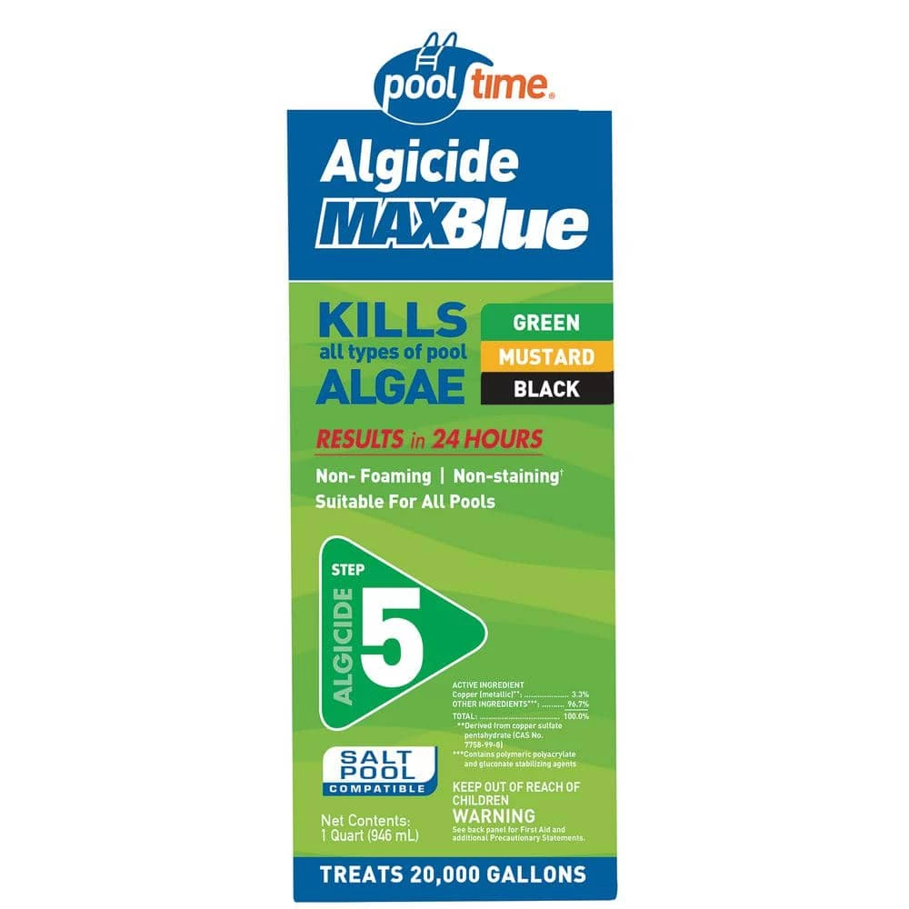 Pool Time Algicide MAXBlue kills and controls all types of pool algae, including green, mustard and black algae. This patented, copper-based formula works in 24-hours to kill algae and return your pool to ideal swimming conditions. This liquid formula is non-foaming and non-staining and is suitable for all pool types. When killing algae, use with a chlorine shock.