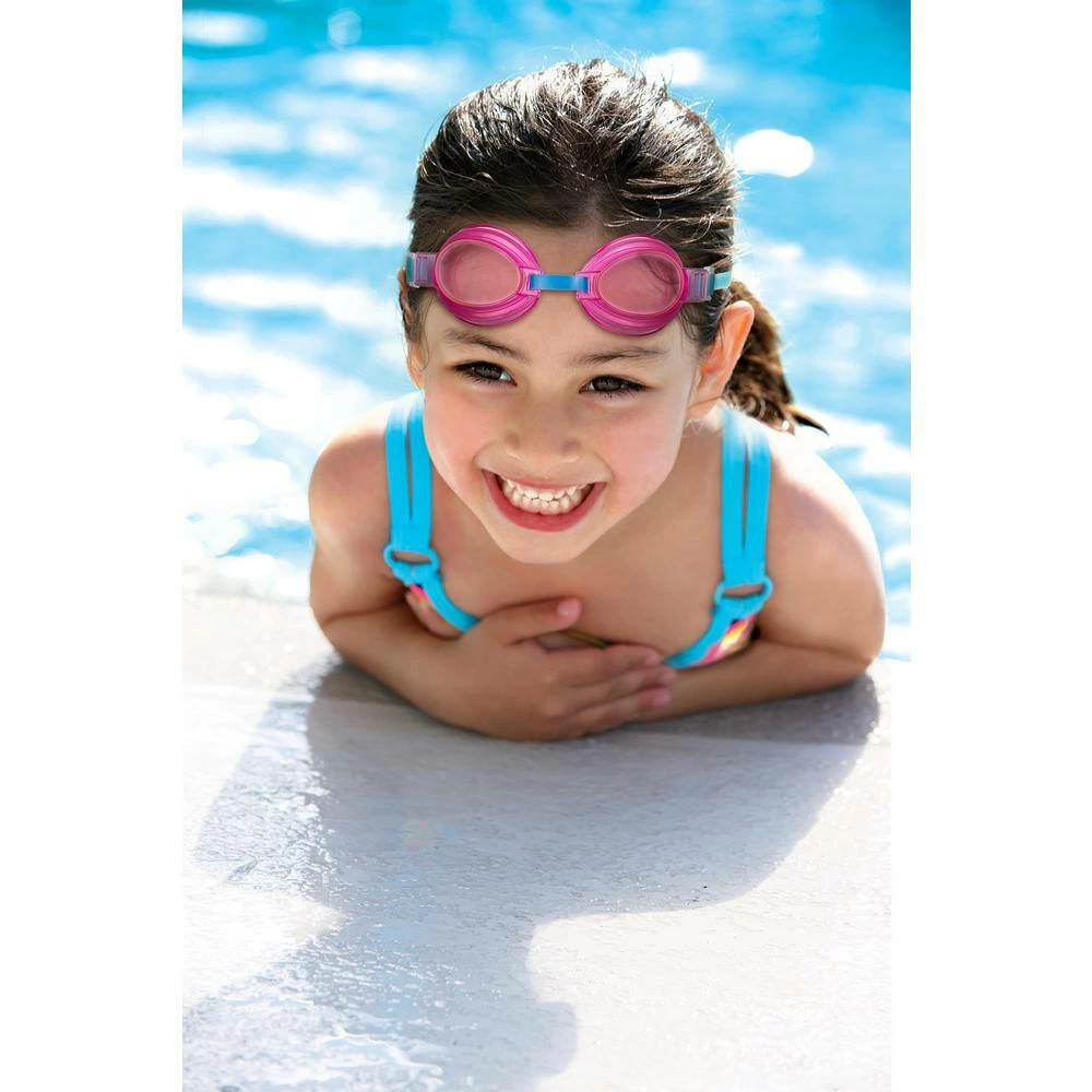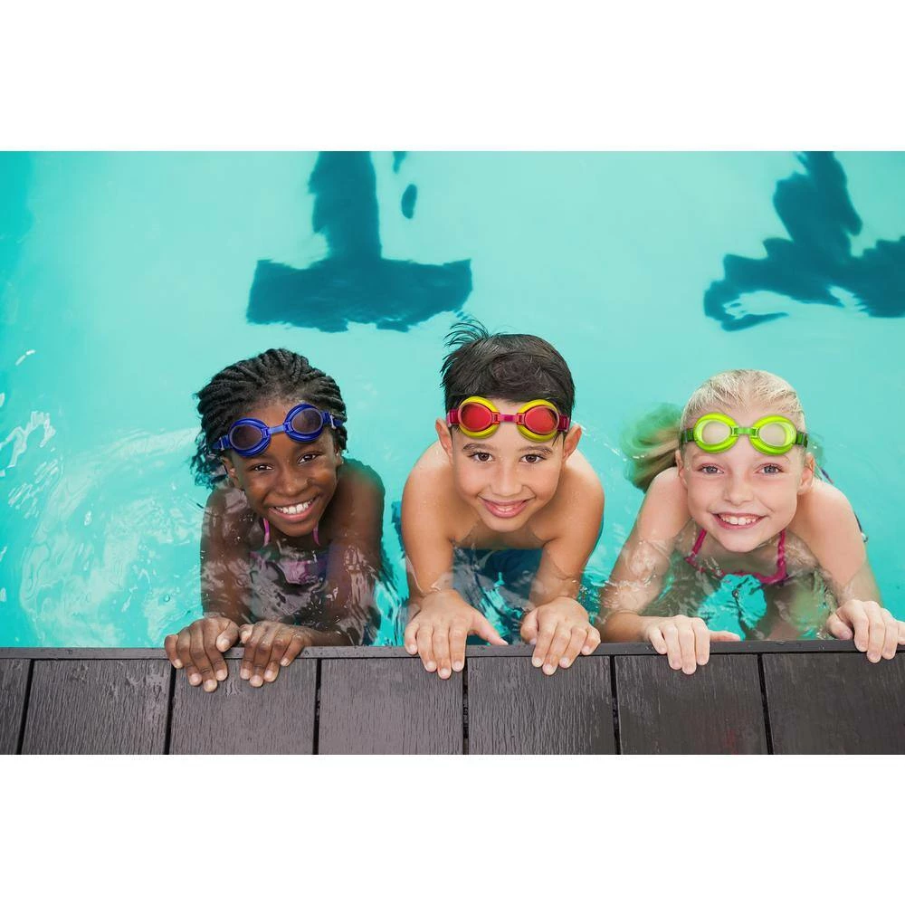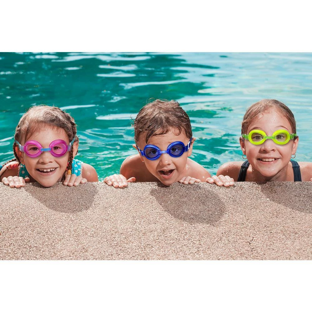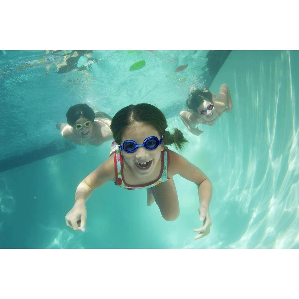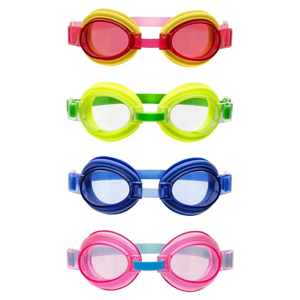 Watch little ones come to life when they’re sporting fun, colorful swim goggles that not only add fun to a day in the water, but they provide all-important eye protection. Impact-resistant lenses are UV protected and designed to minimize scratching, while the PVC eye gaskets add comfort and provide a nice seal. Silicone straps wear well and adjust easily. Adjustable nose bridge helps your little 1 find the right comfort fit. Comes with 1 of each blue, pink, yellow and lime green gaskets with coordinating tints. Latex and BPA free.