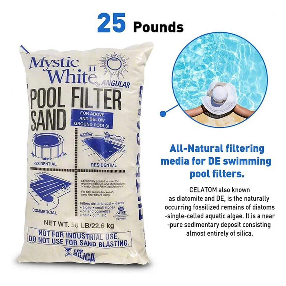 Removing debris within your pool’s water, the Mystic White II Premium Swimming Pool Filter Sand by US SILICA optimizes your filter’s performance for clean, safe water. Graded with a quality, angular shape, the sand provides maximum entrapment of solids, effectively removing dirt, dust, leaves, gum and other debris to leave you with clean, clear pool water. Specially graded, the formula stops clogging and ensures a uniform flow rate through your filter. Carefully screened and graded, the sand reduces problems in the filter. safe for use, the material doesn’t stain or corrode, keeping your pool beautiful while still removing nasty grime and dirt. Chemical-free and safe for use, the material is inert and odorless to create clean, enjoyable water that your kids and guests are sure to love. The 50 lbs. bag of filter sand is designed for use with residential above-ground and inground pools. Creating lovely, clean water in your home’s pool, the US SILICA Mystic White II Premium Swimming Pool Filter Sand beautifies your pool for a clear, relaxing atmosphere.
