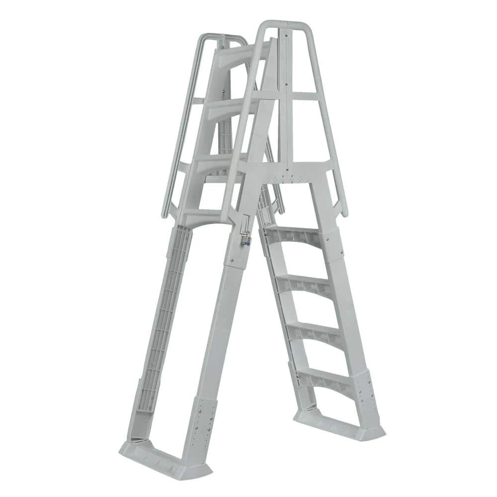 Provide a solid entry and exit from your above-ground swimming pool with the Premium A-Frame Pool Ladder. Made from maintenance-free resin, it has an extra-tread for easy climbing. Extended handrails allow for an easy exit from the pool. Wide treads and the top platform are non-skid for sure-footed traction. The ladder is adjustable to fit above-ground pools from 48 in. to 56 in. D. To prevent unwanted or unsafe entry, the outer ladder section slides up and locks (lock not included). An anti-entrapment barrier prevents kids from swimming between the treads, under the ladder, or behind the ladder. Backed by a 5-year limited warranty.