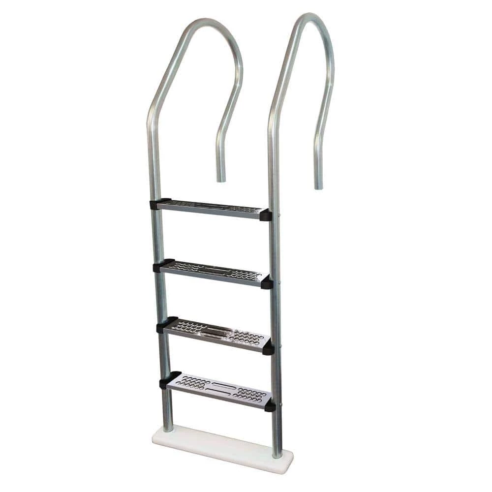 Taller rails ease your exit from the pool with this great new design. Ergonomically shaped handrails shift your body’s weight forward making exiting and entering the pool much easier. Normal handrails force you to remain completely vertical, hindering your ability to exit or enter the pool. With handrails that extend up to a full 36 in. above the deck, you’ll also have more support without bending over and straining your back. Our Premium Stainless Steel Reverse Band Ladder has 24 in. wide stainless steel treads with non-skid, 5 in. deep steps for secure footing. Designed to fit pools from 48 in. to 54 in. deep, this stainless steel ladder is super strong and will easily accommodate 300 lbs. The unique pivot bottom accommodates sloped pool bottoms. Two premium quality aluminum flanges and stainless steel hardware are included for secure deck mounting. 1-Year Warranty.