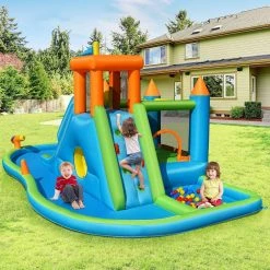 735-Watt Fabric Slide Water Park Climbing Bouncer Bounce House with Tunnel and Blower by Costway