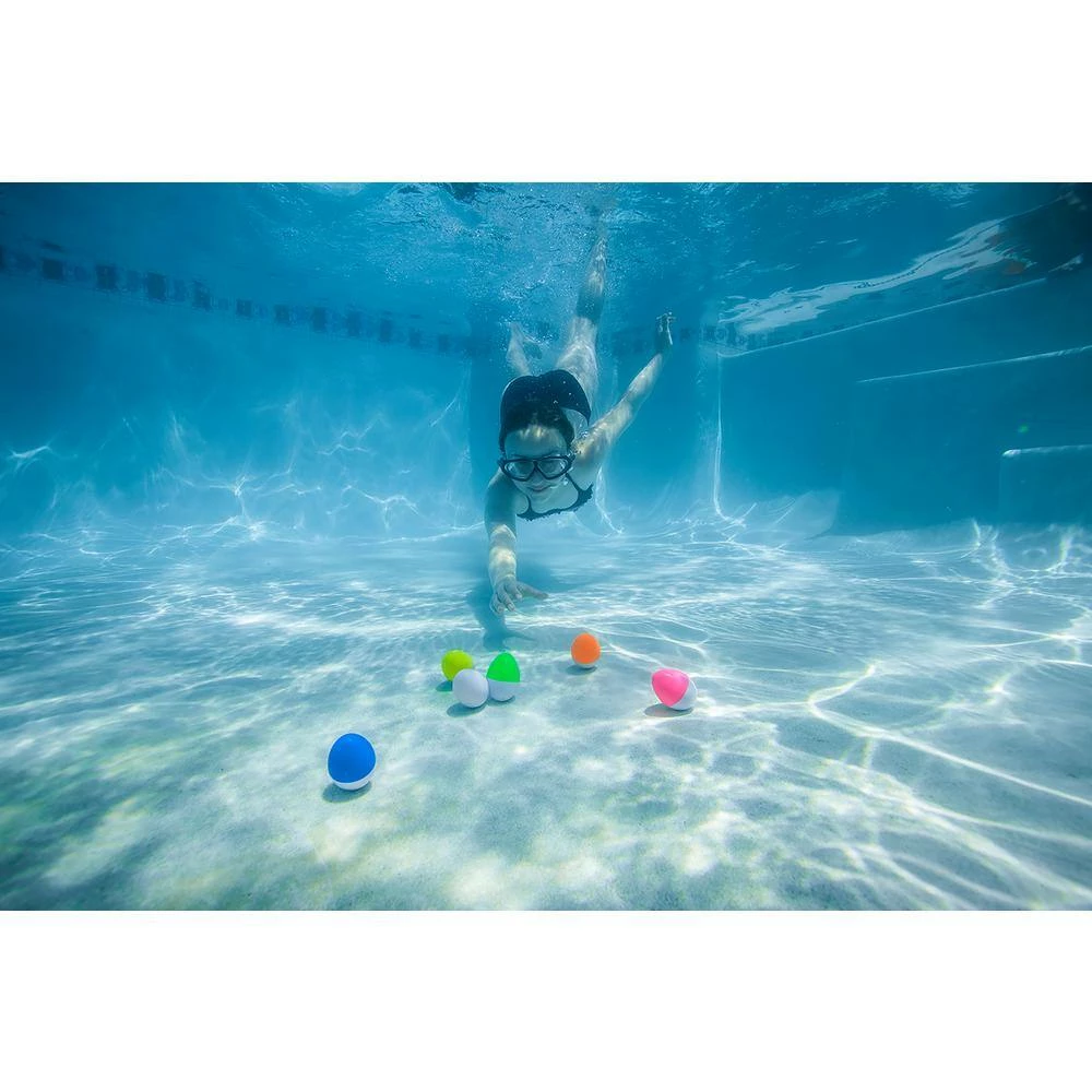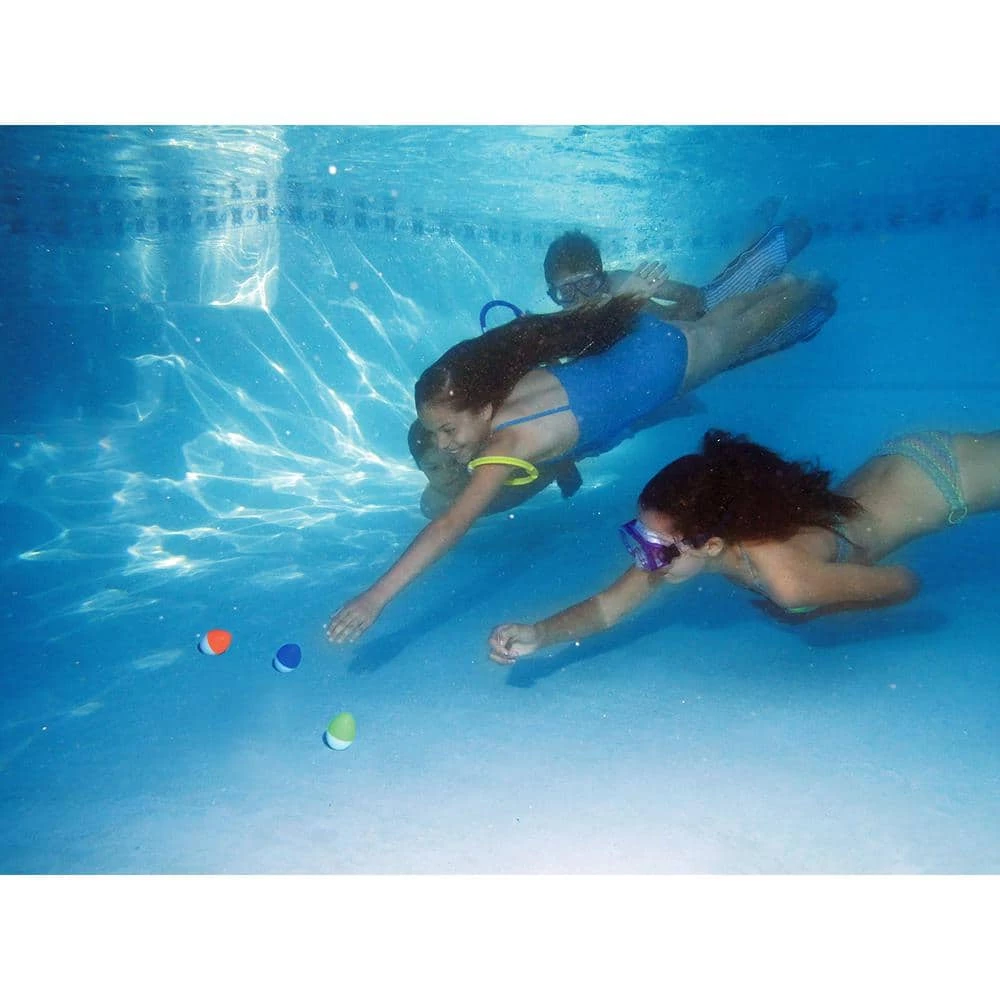 The Rotten Egg Game by Poolmaster includes 6 plastic eggs weighted for submergibility for diving action. Create your own rules for play. Simply toss and wait for them to submerge then go. Or for a more advanced level of play, toss the eggs in the pool and see if you can catch them before they reach the pool bottom. Each egg comes apart to reveal a number for scoring. or the ‘rotten egg’. Don’t get the rotten egg. Use your imagination for a fun water play.