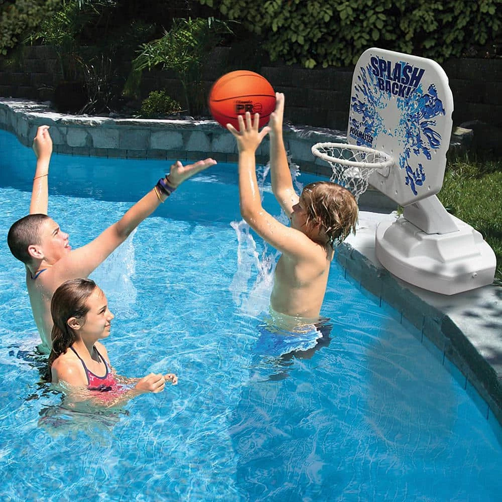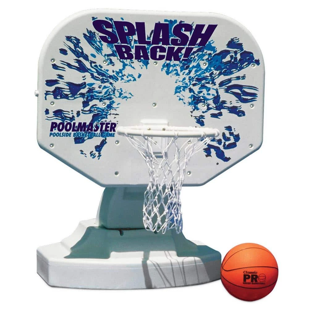 The Poolmaster Splashback Poolside Basketball Game provides the ultimate level of fun on a summer afternoon. Defy gravity when you play basketball in the pool. Kids will love casual 1-on-1 games, and parents will love seeing their kid get some exercise. In addition, with this large backboard you will never have to chase stray balls again. The Poolmaster Splash back Poolside Basketball Game is necessary have at your next pool party. People of all ages love shooting hoops. The amount of games you can play are endless: 1-on-1, 3-on-3, slam dunk contests, and even skill competitions. Includes ball. This hoop features a heavy-duty 27 in. x 22 in. base that can be filled with water or sand. The backboard measures 34 in. x 25 in. This hoop is 45 in. tall. The basket diameter is 14 in.