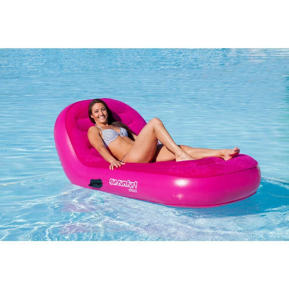 Airhead SunComfort Cool Suede Single Chaise Lounge SunComfort Cool Suede Single Lounge is available in 3 attractive colors, Lime, Raspberry and Sapphire. The Cool Suede material has a velvety suede-like feel to it, never sticky. Wet it down and you’ll enjoy an incredible cooling sensation. These over-sized chaise lounges provide ultimate luxury poolside, on the beach or in the water. Tanning or reading, keep a cool drink close at hand in the convenient drink holder. A molded rope holder is great for tethering to docks, buoys or boats when using them in lakes. The patented Speed Safety Valve allows quick and easy inflating and deflating with no parts to lose. Mix or match colors.
