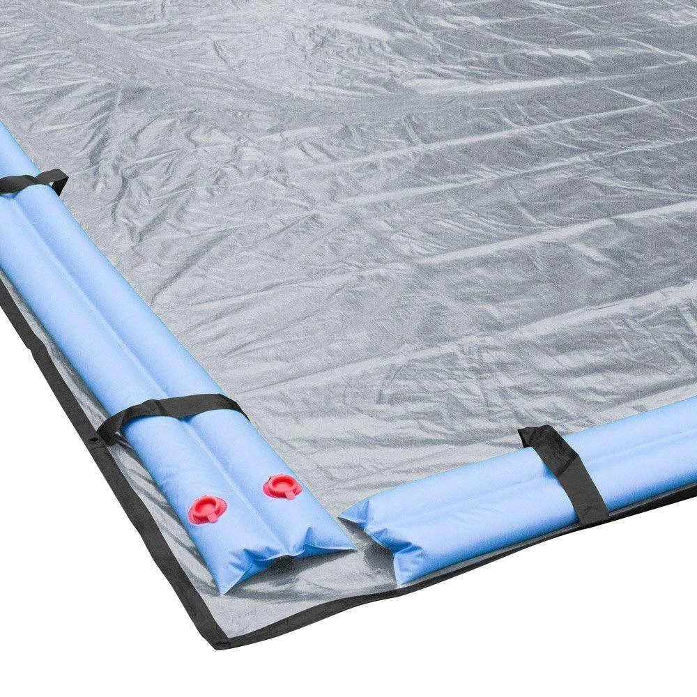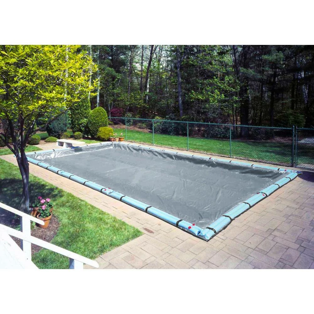 The Ultra pool cover is a premium solid winter cover. Solid pool covers do not allow water to pass through their material. This winter cover is intended to be used during the off-season. Please order by your pool size, as the overlap goes beyond the pool size listed. Please order a larger size cover if you have steps protruding from your pool. This cover includes a 5 ft. overlap. The Ultra winter cover features a premium scrim count (threads per square inch). The Ultra pool cover has a premium 12 x 14 scrim. Heavy-duty premium polyethylene weighs 4.5 oz./yd2. Both the scrim count and material weight are the best indicators of the overall strength and durability of your pool cover. Includes a premium quality binding around the perimeter of the cover that prevents against wear and tear and adds to the life expectancy of this cover. The dove grey topside of this cover is coated to prevent damage caused by the sun’s ultra-violet rays and the bottom side is black to prevent algae growth. Premium water bag loops (water bags sold separately) are placed every 4 ft. Water bags or water tubes are the only recommended method of installation. The cover should be able to comfortably float on the pool water without excessive stress. Includes a 20-years warranty.